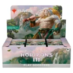 This Modern Horizons 3 Play Booster Box contains 36 Play Boosters. Each Play Booster contains 14 Magic: The Gathering cards and 1 Token/Ad card, Helper card, or Art card. (A regular Art card can be found in 30% of packs and a foil-stamped Signature Art card can be found in 5% of packs.) In every pack you will find a combination of 1–5 cards of rarity Rare or higher and 3–6 Uncommon, 5–9 Common, and 0–1 Land cards. One card of any rarity is Traditional Foil. Foil Borderless Fetch Land in <1% of boosters. Traditional Foil Land appears in 20% of boosters.