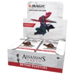 The past is yours to explore! This Magic: The Gathering – Assassin’s Creed Beyond Booster Box contains 24 Beyond Boosters. Beyond Boosters provide a curated opening experience for fans, with 7 Magic cards and 1 token/ad card or Art Card (Art Card in 8% of packs) in each pack. Every pack includes a combination of 1–4 card(s) of rarity Rare or higher, 3–5 Uncommon cards, and 0–1 Basic Land card. A foil-stamped Signature Art Card replaces the Art Card in 1% of Beyond Boosters. A Traditional Foil Borderless Mythic Rare card can be found in <1% of boosters.