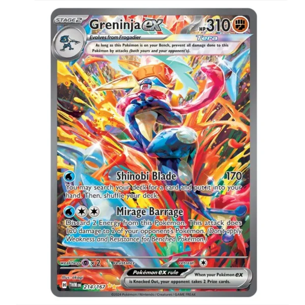 Greninja ex is a Special Illustration Rare (Stage 2,Tera,ex) Fighting type Pokémon card from SV6 – Twilight Masquerade (214/167)