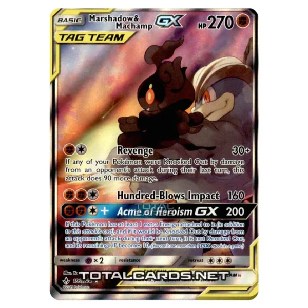 Marshadow & Machamp is a Full Art|GX – (Basic) Fighting type Pokemon card from SM10 Unbroken Bonds. (199/214)